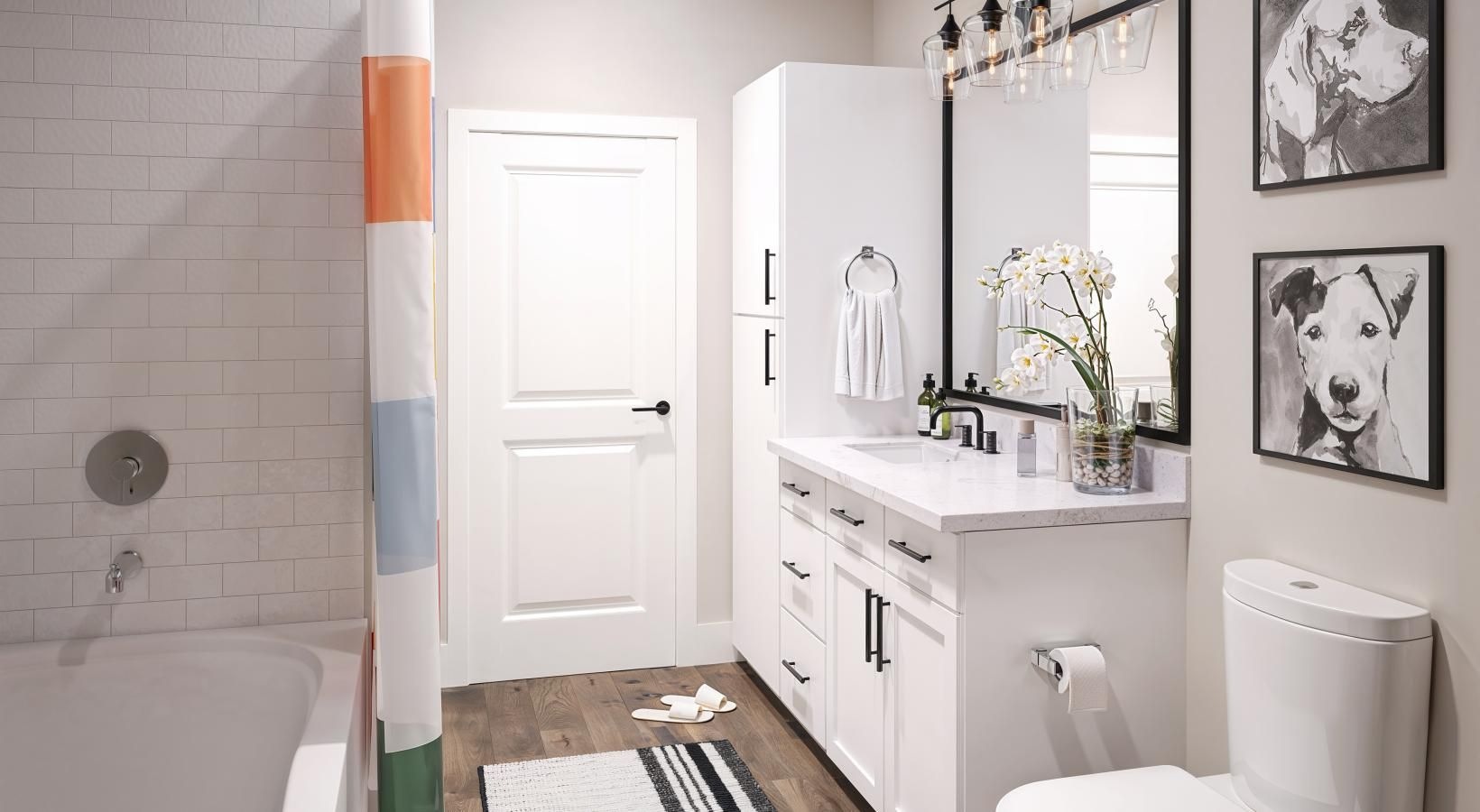 • a spacious bathroom with a large mirror and ample light