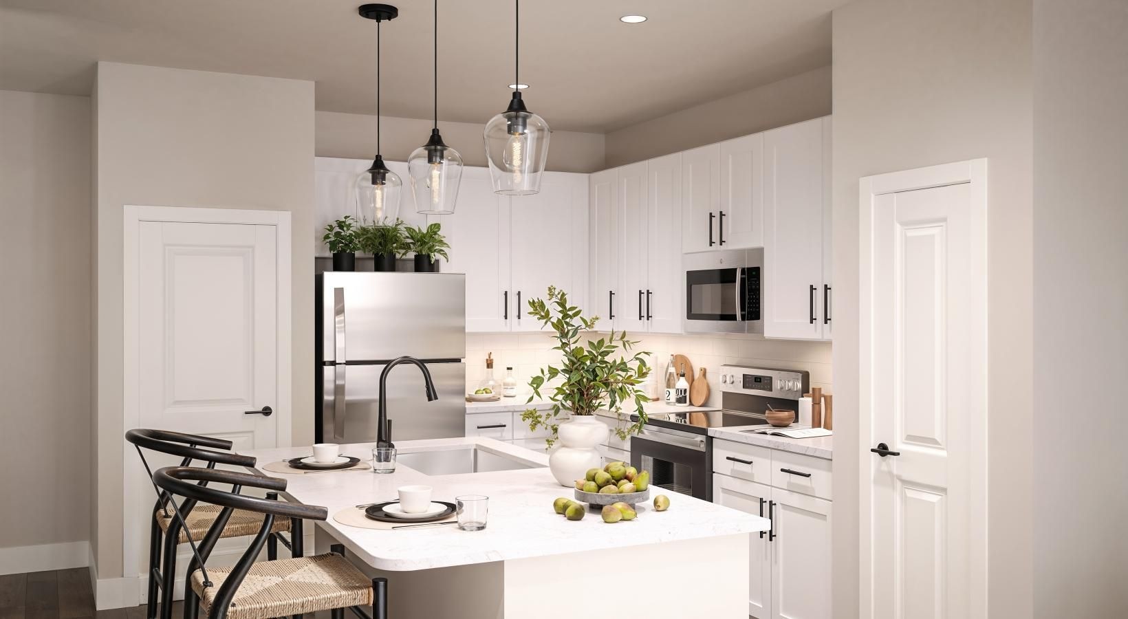 • a kitchen with white cabinets